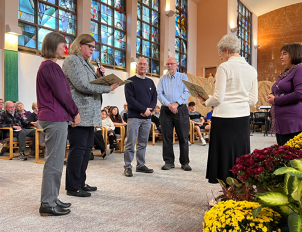 On November 10, a special liturgical celebration was held in our motherhouse chapel to bless and welcome the new covenant companion leadership circle (CCLC). They are Ophelia Barsketis, Dave Pfeifer, Tom Ruggaber, Kathy Schneider (who lives in Michigan) and Vickie Wojciechowski. We also thanked the outgoing CCLC: Mary Ellen Durbin, Consuelo Cabral, Sue Monaco, Joanne Pfeifer and Karen Diersen. As covenant companionship continues to evolve and thrive, they bring many gifts and talents to our region as we together create a flourishing future.
